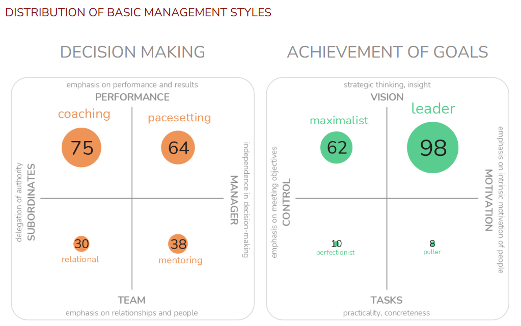 LEADER – Leads through a strong vision, uses people’s intrinsic motivation, leaves a lot of freedom in the choice of course of action, says where the team is going and why.